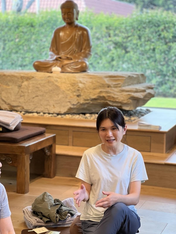 The relaxation session led by Master Guoyuan was very gentle and detailed. After adjusting my sitting posture, I breathed slowly and then practiced a slow, clear body scan from the scalp to the toes, repeatedly allowing myself to feel my body and mind gradually relax. On the first and second days, I struggled against drowsiness. I tried to keep my eyes wide open and even let tears flow, but to no avail. However, on the afternoon of the second day, the drowsiness suddenly lifted. This is impermanence. Even such small changes brought me joy. After returning home, I found that my previously injured ankle felt much more flexible and smooth.