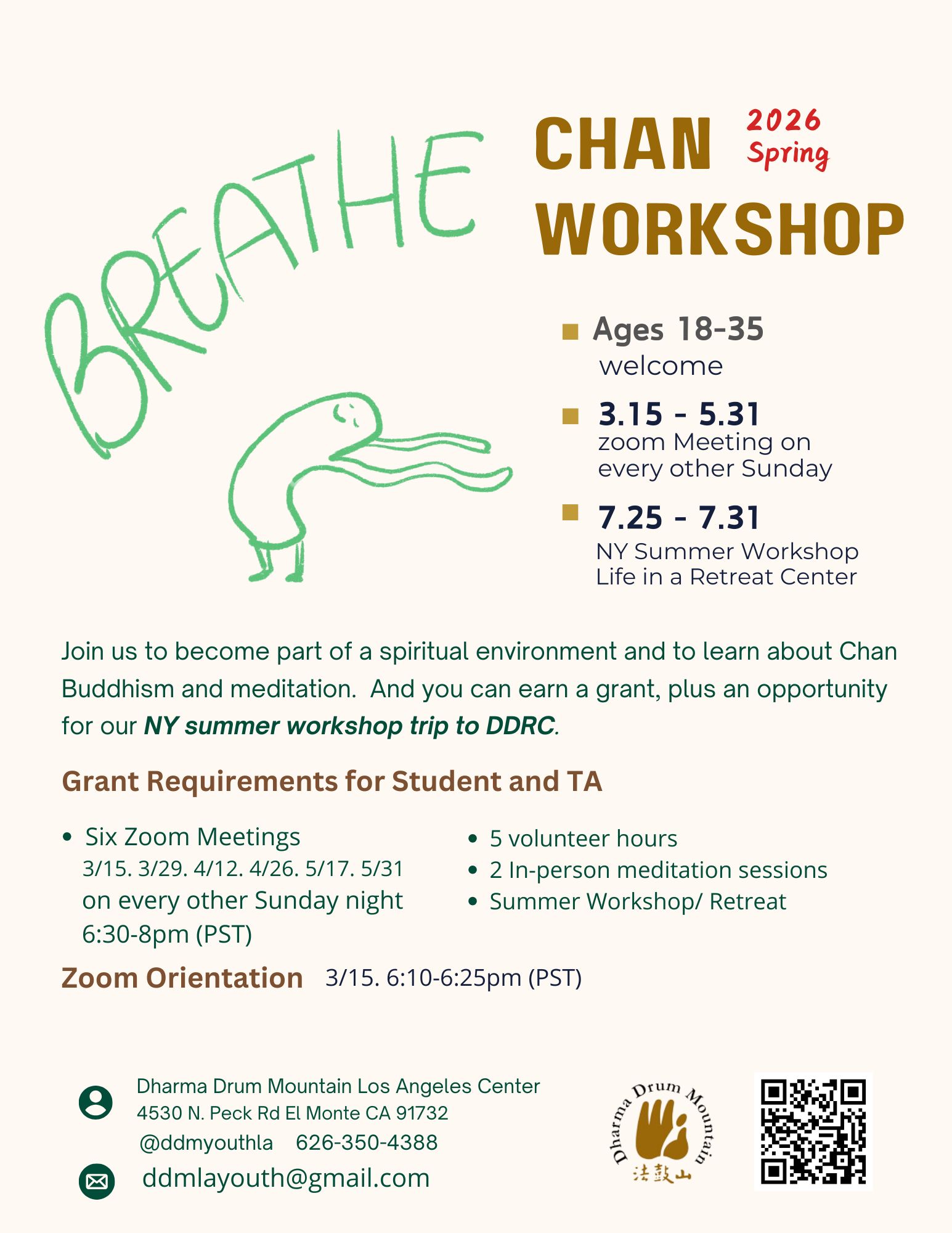 Join us to become part of a spiritual environment and to learn about Chan Buddhism and meditation. And you can earn a grant, plus an opportunity for our New York summer workshop trip.