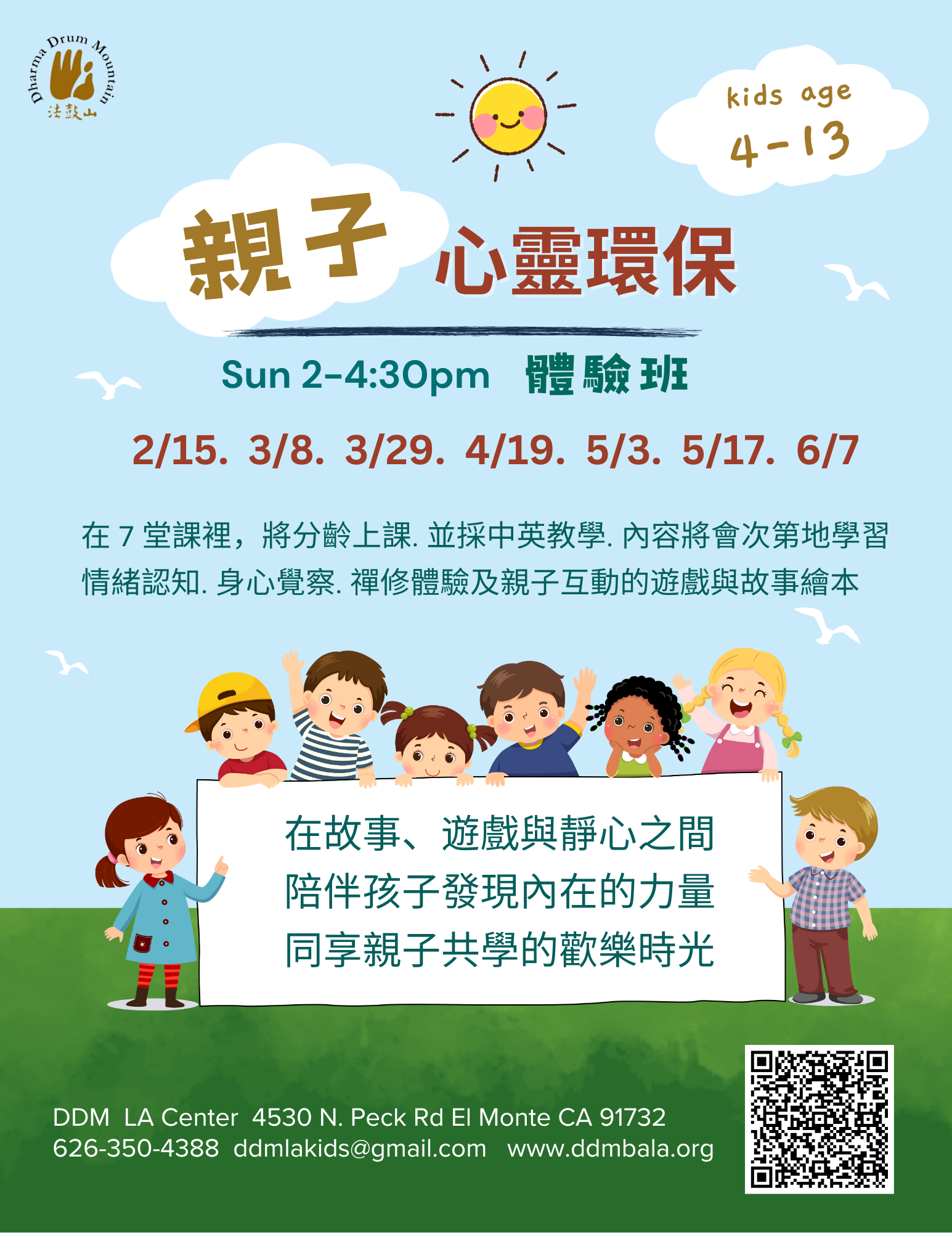 歡迎家長帶著家中的小菩薩,ㄧ個月回道場ㄧ次,從歡樂有趣的遊戲中,學習如何作好自己的心靈環保,感受不同的親子關係,陪伴小菩薩健康快樂的成長。如當天家長(或家中長輩)有事無法陪同,道場有義工叔叔和義工阿姨會隨堂陪伴。名額有限,額滿截止,儘早上網報名。