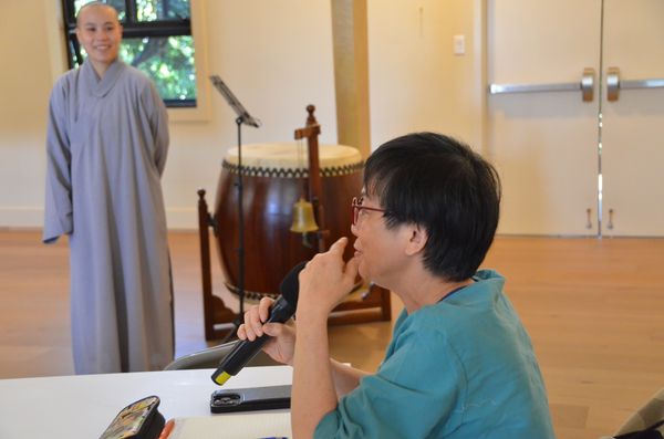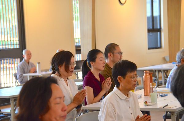 隨後法師帶領大家體驗「耳根圓通」的練習。練習時,就像耳朵變成一塊吸音板,讓所有聲音自然流入,不去評判、不去回應,也不產生第二個念頭,只是單純地聽。這樣的練習,讓人慢慢體會到一種寧靜而清明的覺照。