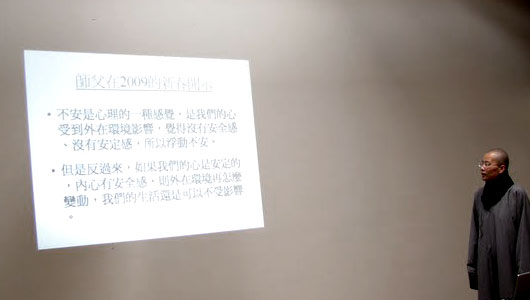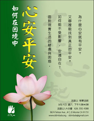在初春的一個週末(3月7日),常華法師從紐約來到洛杉磯,為這裏的信眾舉行了一場《如何於困境中心安平安》的演講開示。隨著景氣衰退,失業人潮不斷往上攀升,越來越多人面臨前所未有的生活危機,在這惡劣的大環境中,如何保持內心安定,用智慧處理困境中種種問題,為自己與家人帶來平靜自在的生活,是這場活動的主要目的。常華法師為大家講述如何於困境中,讓心處變不亂,在似乎沒有希望的日子中能找著出路、安頓身心,「心安就有平安」,永遠抱持樂觀、信心面對各種挑戰。