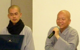 兩位法師在傳燈後分享一些與師父之間的小故事。果元法師在第一次與師父的接觸 後,發現師父非常平易近人,也讓人對他相當信任,很容易不由自主地與師父分享心事。 不管外在環境如何,師父都可以隨處自在,其忍耐力也是非常的強,無論是去寒冷、偏遠 或是生活水平落後的地區弘法,師父為了宣揚佛法而無怨無悔的堅持下去。因為他相信, 只要有信心,有實踐力,就不會怕失敗。如同他當初要改變台灣喪葬習俗的傳統觀念,也 是不怕民眾對佛教喪葬儀式的排斥與誤解,慢慢地去改變,去宣導正確的觀念,後來就有愈來愈多的民眾逐漸接受了佛教化的喪葬麼儀。師父如此堅強的毅力,我們真的還要多多 學習,不僅僅是在傳承佛法的工作上,更要運用在我們的生活與工作上。