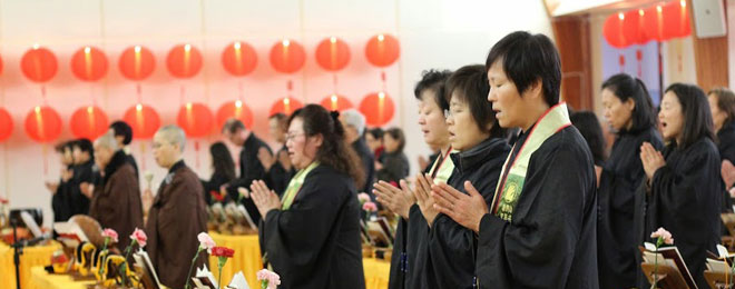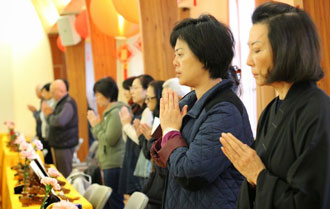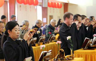 開春第一天由「金剛經誦經祈福共修」為道場迎春第ㄧ響炮。雖然當天美國沒有放假,但仍有近90位信眾共襄盛舉,祝福ㄧ切有情皆能開智慧,離苦得樂。法會均設有消災、祈福、超薦、隨喜牌位及佛前供燈,香積組菩薩並特別準備美味年菜「喜洋洋素齋」及應景糕點與大眾結緣。其中有位94歲的劉菩薩,護持洛杉磯道場將近20年了,聽說道場有固定的常住法師,也特定與同修前來給法師拜年!