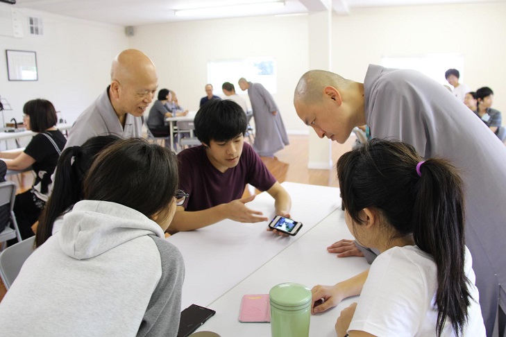 然而,大人的期許與孩子的想法,有時候難免是會有落差的。第一天傍晚,就有兩位學員吵著要回家,初學打坐還沒產生興味,但主要是不清楚這些禪宗傳承祖師跟他們有什麼關聯,也不太適應傳統單向的指導方式,他們比較喜歡互動、分享式的學習。經過耐心傾聽年青人的想法,與學員進一步的了解與討論後,法師們也隨順因緣在第二天的工作坊中多了一些互動及分組討論的內容,讓他們用手機在園區拍攝照片,再小組與大堂分享拍攝的動機與意涵,讓他們有機會從生活中觀察不同的變化,體驗禪無處不在的精神。托水鉢與書法禪對他們來說也是新鮮的課程,工作人員在托水鉢動線中設了重重關卡,一一突破之下,已是滿頭大汗了! 而在美國長大的小孩,中文能力通常不是那麼的好,更遑論拿毛筆寫書法了,寫下一句話送給自己想送的人,每個人開始認真了起來,專注練習一遍又一遍,讓人欣慰的是他們寫起來真的有模有樣,待家長來接孩子時,看到孩子的作品也是既驚訝又開心!